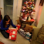 Danach hieß es: Endlich Geschenke auspacken! Von manchen wurde ich schon gefragt “Werden Geschenke in den USA nicht eigentlich erst am ersten Weihnachtsfeiertag morgens ausgepackt?” – laut meinen Gasteltern macht es aber eigentlich jede Familie einfach, wie sie will (übrigens kann man Santa sogar unter http://www.noradsanta.org/ verfolgen). Und da ich es sowieso nicht mehr erwarten konnte, wurde es dieses Jahr eben German-Style gemacht! Schon in der Woche zuvor hatte ich nämlich Pakete von meiner Familie und Freunden bekommen, die seit dem unter dem Christbaum darauf warteten, von mir ausgepackt zu werden. Vieeeeeeelen lieben Dank nochmal an alle, die an mich gedacht haben! Ich habe wirklich nicht mit so vielen tollen Sachen gerechnet – mein Schokoladenvorrat ist jedenfalls vermutlich für das ganze restliche Jahr gesichert. Laut Dale gab es noch nie so viel Schokolade in ihrem Haus. Auch an ihn und Michal haben meine Eltern gedacht, und ihnen Süßes (neben einer riesen Box Plätzchen gab es noch Stollen, eine riesen Tafel Milkaschokolade und Baumkuchen), eine Kerze und eine Schürze zugeschickt. Nach der Bescherung fuhren Dale, Zhenzhen und ich noch ein bisschen in Mt. Vernon herum, um die verrückte Weihnachtsbeleuchtung zu begutachten, mit der manche Häuser hier dekoriert sind und die viele von Euch wahrscheinlich schon aus Filmen kennen. Aber seht selbst: