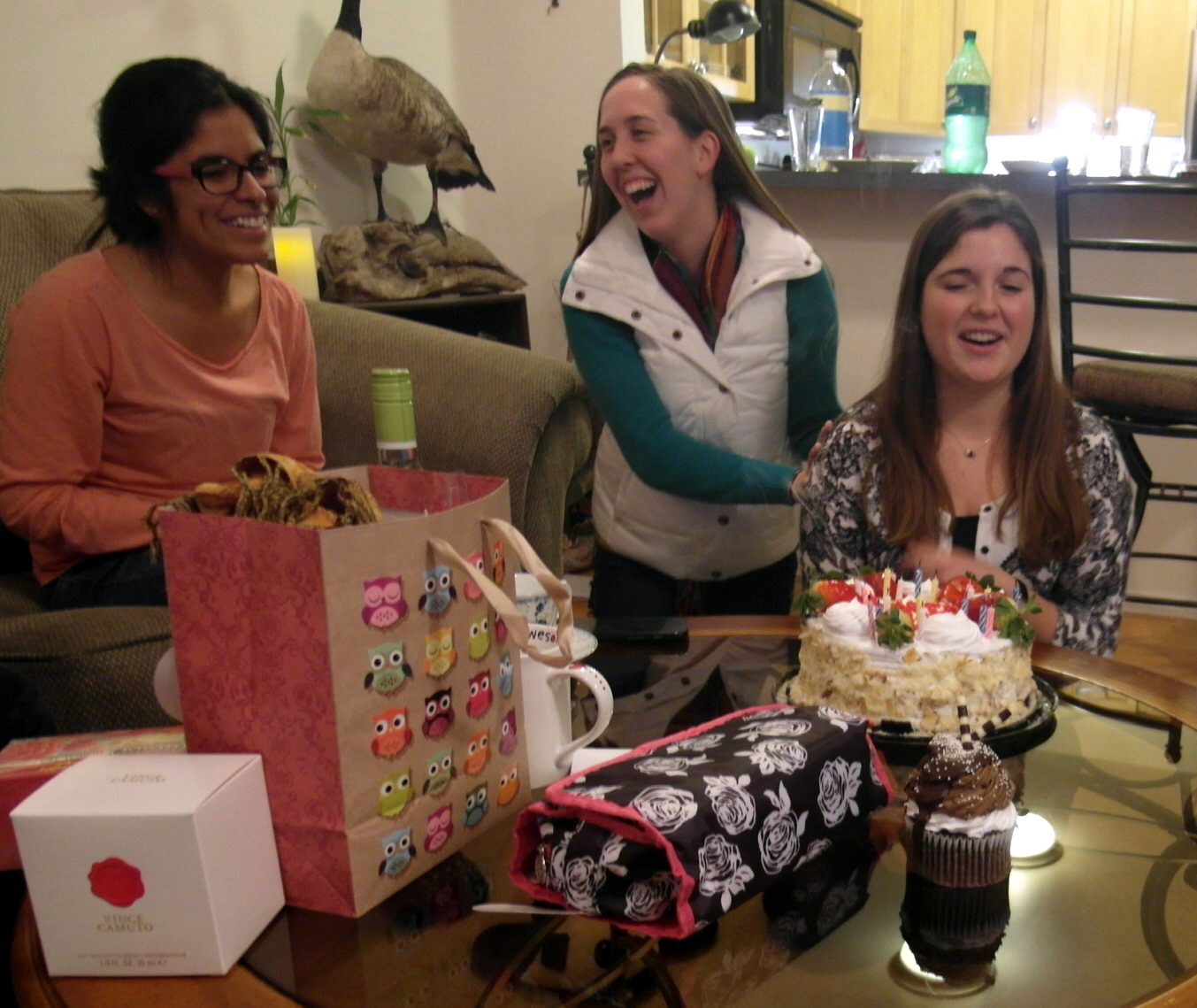 Als Dessert gab es dann von mir zubereitetes Mousse au Chocolat, einen Kuchen (leider sieht man auf keinem der Bilder die schöne Aufschrift mit “Happy Birthday Julia”) und einen RIESEN Cupcake. Das Auspusten der 20 Kerzen stellte sich dann doch als nicht ganz so einfach heraus, da eine Kerze dabei war, die sich immer wieder selbst anzündete (danke, Christine!).